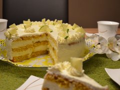Um den untersten Tortenboden einen Tortenring legen, mit der Hälfte der Creme bestreichen, den Boden darauf legen. Die restliche Creme darauf verteilen, mit dem letzten Boden abdecken und die Torte ca. zwei Stunden kalt stellen. 400ml Sahne steif schlagen, Limetten in Scheiben schneiden und halbieren. Die Torte mit Sahne bestreichen und zum Schluß mit den Limettenscheiben verzieren.